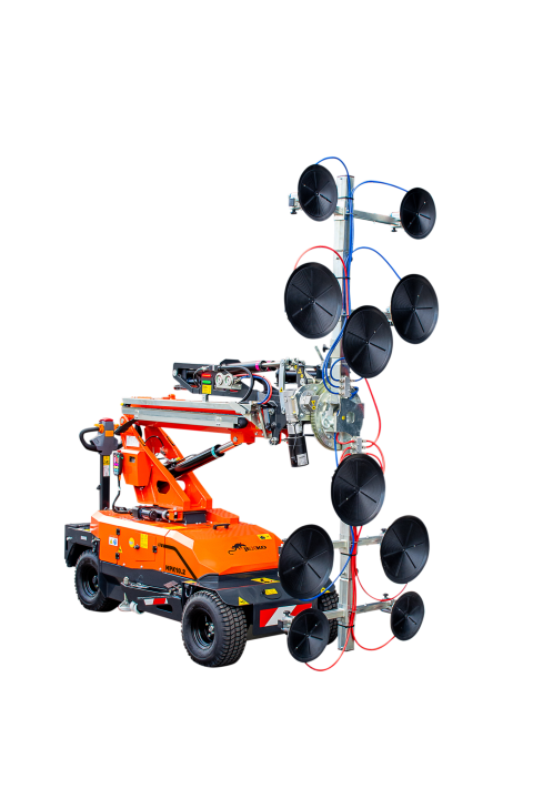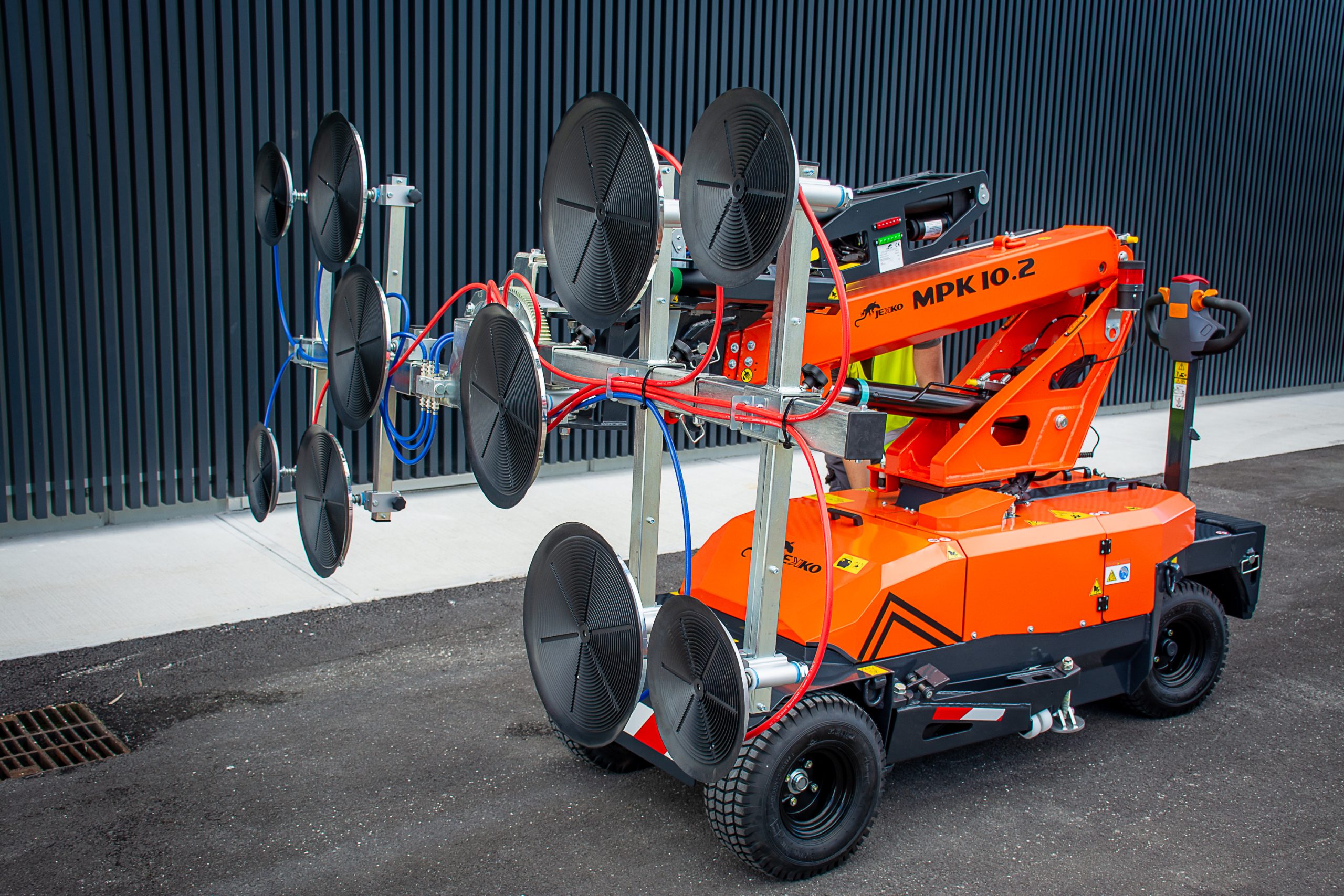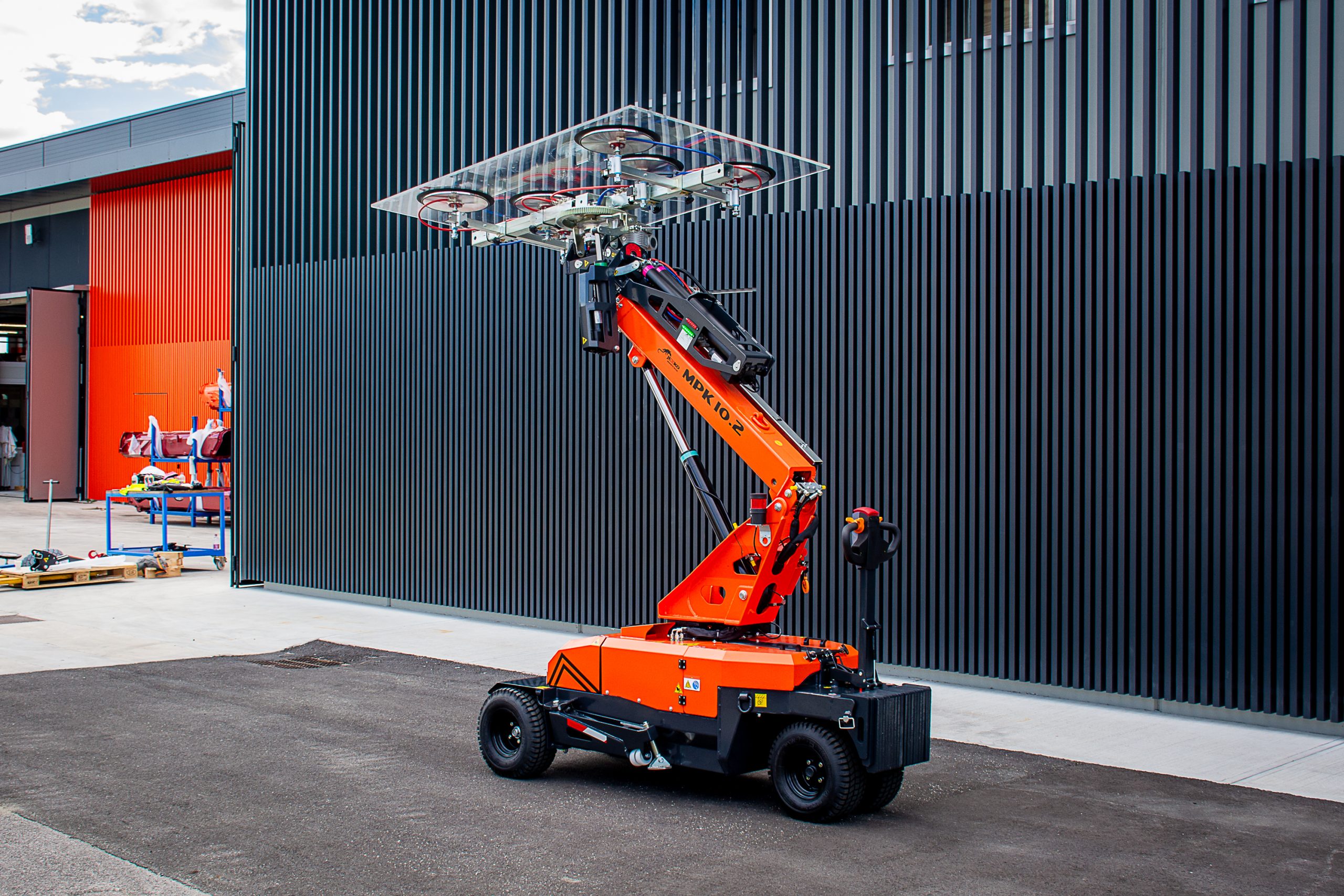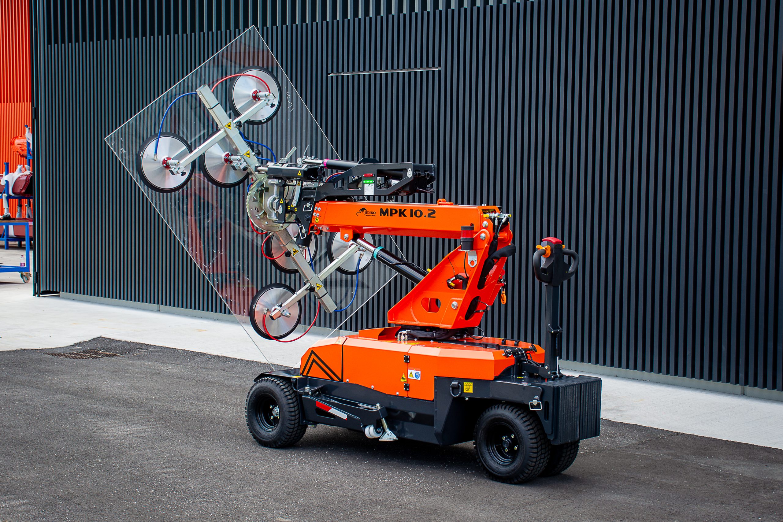 Discover MPK10.2, the 2,180 lbs full electric 2in1 minipicker: an extremely compact glass robot and pick & carry crane all in one machine. The new improved vacuum manipulator with modular and customisable layout allows to easily position glass, marble, monopanels or smooth panels of any kind.