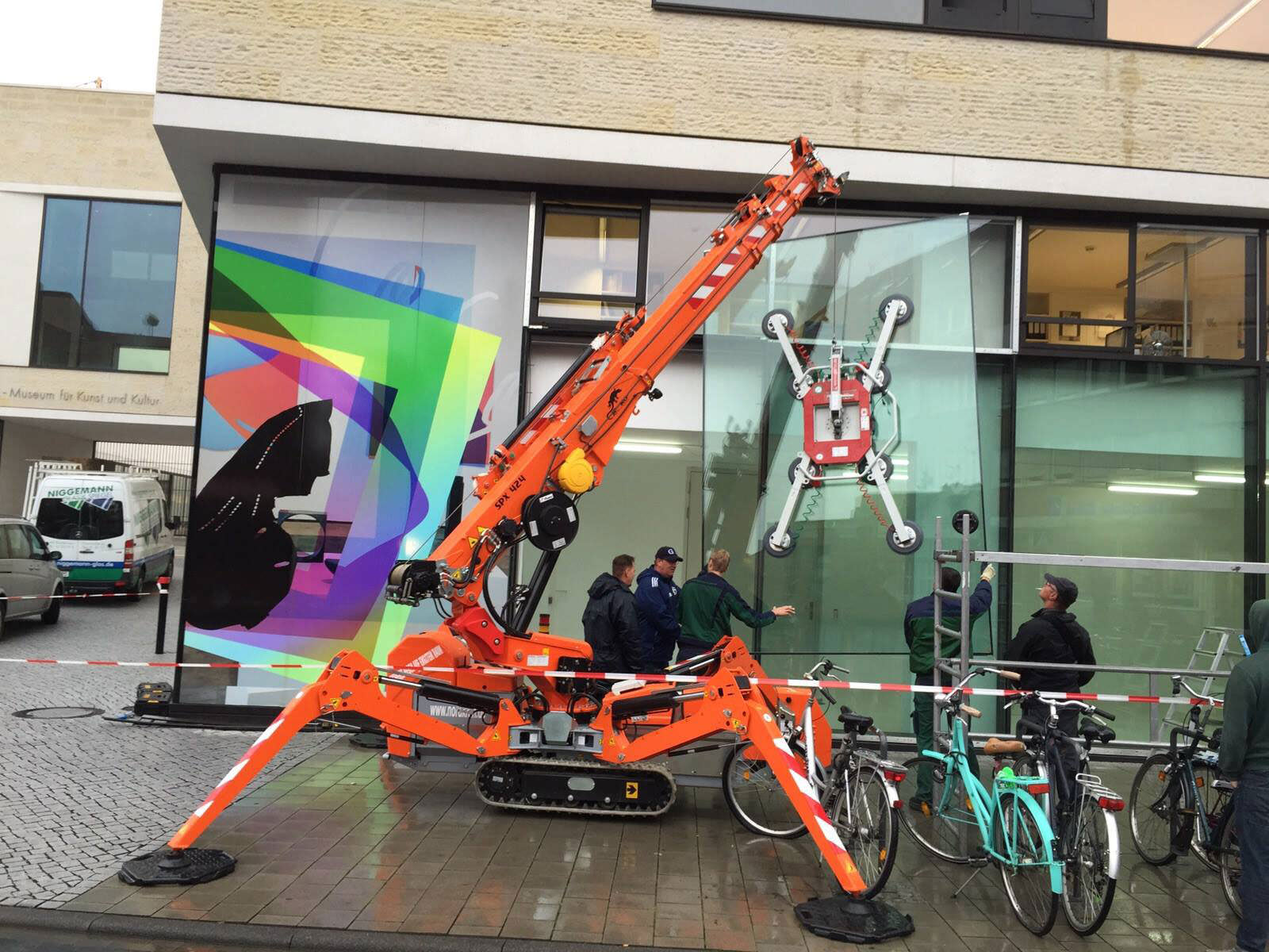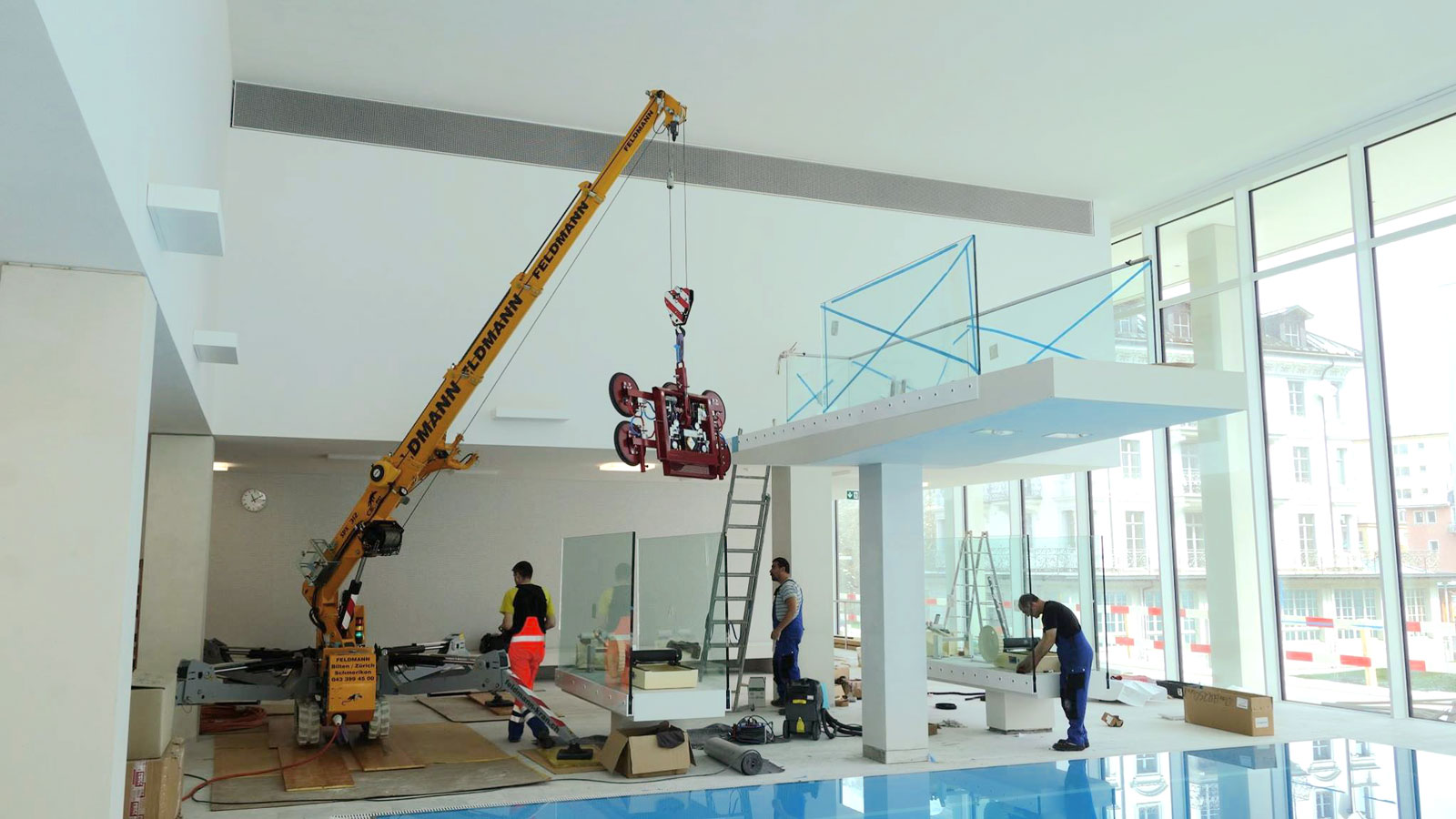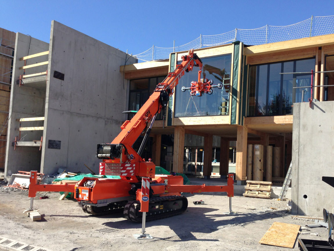 Installation of glazing and curtain walls on buildings and skyscrapers, handling of glass panes and non-porous materials by means of hydraulic manipulators and vacuum lifters integrated in our cranes.